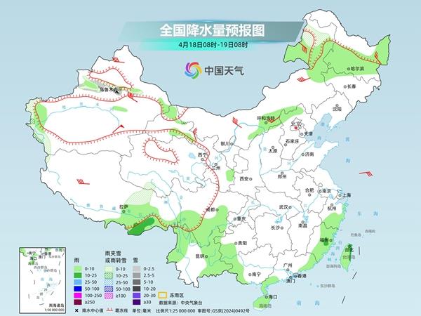 后天,内蒙古东北部、黑龙江、新疆沿天山地区、青海中北部、甘肃中部、西藏北部和东南部等地部分地区有小到中雪或雨夹雪,其中,内蒙古东北部、黑龙江西北部、新疆沿天山地区等地部分地区有大到暴雪;贵州东部和南部、重庆东南部、湖北南部、江南中西部、华南北部等地部分地区有中到大雨,其中,湖南中南部、广西北部等地部分地区有暴雨或大暴雨。